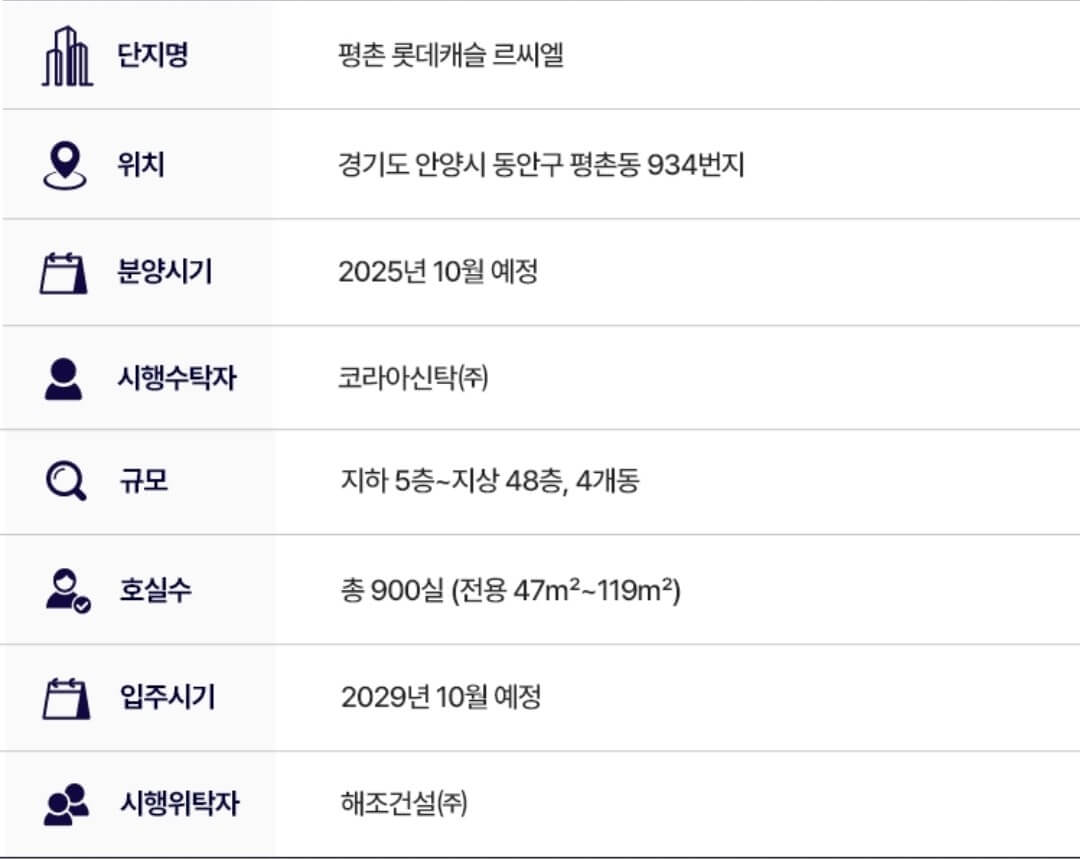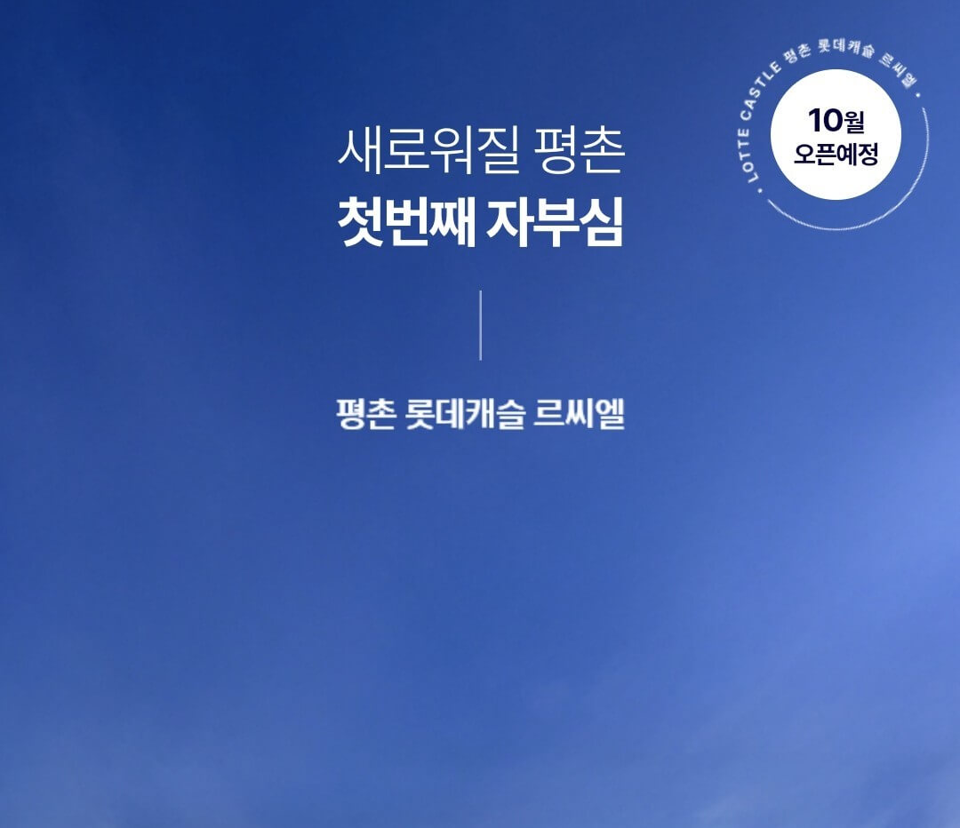 오는 10월 안양시 평촌동 934번지 일원에 들어서는 평촌롯데캐슬 르씨엘의 분양을 준비하고 있습니다. 단지는 지하 5층~지상 48층, 4개 동, 총 900실 규모로 조성됩니다.