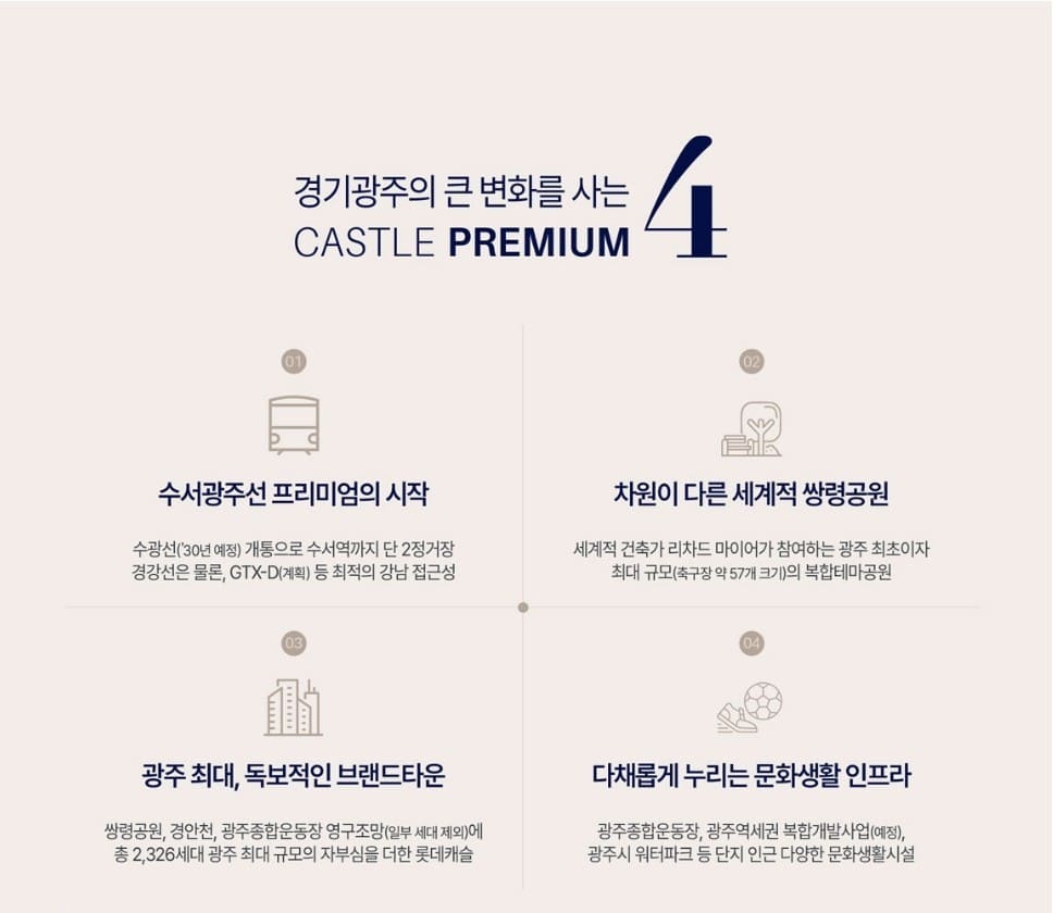 경기광주역 롯데캐슬 시그니처 자연·교육·역세권 세 가지 프리미엄을 모두 갖춘 입지로, 쾌적한 주거환경과 높은 미래가치를 기대할 수 있습니다. 자연 친화적 환경과 뛰어난 교육·교통 인프라를 갖춘 복합 입지로써 미래가치가 높은 주거지로 평가되고 있습니다.